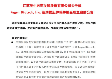 8月11日晚,*ST苏吴 (600200.SH)公告称,公司控股孙公司达透医疗器械(上海)有限公司就Regen Biotech, Inc.违约事项向深圳国际仲裁院提起仲裁,请求确认《独家代理协议》有效并继续履行,若未得到支持,初步索赔损失人民币16亿元,目前已获得受理立案。
